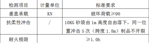 1.排氣道制品的垂直承載力、抗柔性沖擊、耐火極限等性能指標(biāo)應(yīng)符合下表的要求。